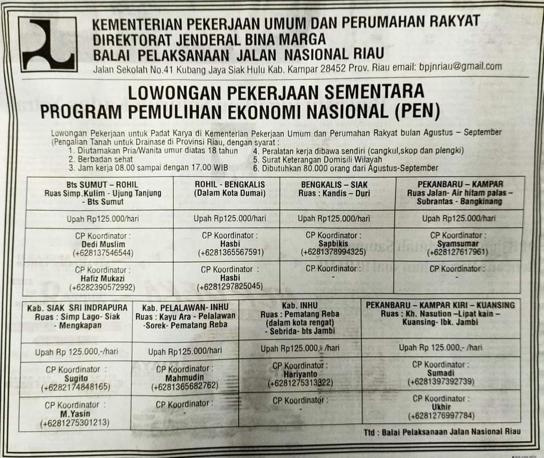 Lowongan Pekerjaan untuk Padat Karya di Kementrian Pekerjaan Umum Dan Perumahan Rakyat bulan Agustus – September (penggalian tanah untuk drainase di Provinsi Riau dengan syarat;